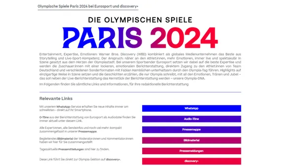 Die Pressemappe mit Infos zu den Olympischen Spielen bei Eurosport: In der Eurosport-Pressemappe zu Paris 2024 finden Sie alle Informationen zum linearen und digitalen Sendekonzept, einen detaillierten Programmplan für Eurosport 1, Hinweise zur "Medal Zone" sowie den Live-Shows “Bonjour Paris” und “Bonsoir Paris” und zur neuen und erfrischend anderen Streaming-Show “StreamD”, die - täglich live aus dem Deutschen Haus in Paris gesendet - bei discovery+ zu sehen sein wird.